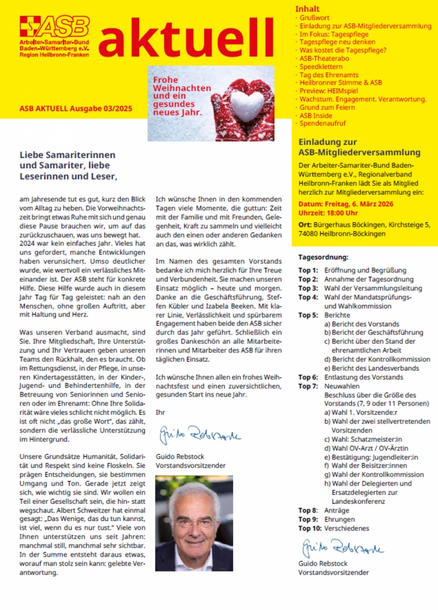Im Fokus unserer Weihnachtsausgabe ASB aktuell steht diesmal die Tagespflege. Erfahren Sie mehr über die Hintergründe, News zur Mitgliederversammlung und freuen Sie sich mit uns über die Highlights unseres Verbandes! Die Weihnachtsausgabe unseres Mitglieder-Magazins ASB aktuell steht Ihnen bereits heute zum Download hier zur Verfügung. Dazu klicken Sie auf den folgenden Link: ASB aktuell 03/25. Die PDF-Datei finden Sie dann im rechten Bereich der Seite.